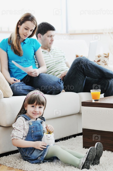Молодая счастливая семья в гостиной