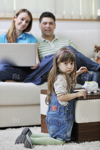 Молодая счастливая семья в гостиной