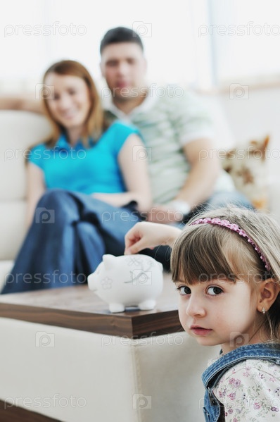 Молодая счастливая семья в гостиной