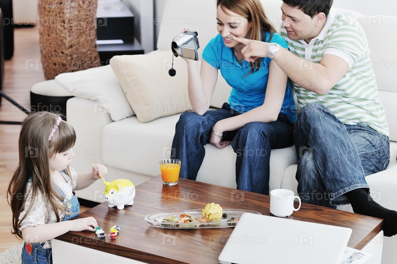 Молодая счастливая семья в гостиной