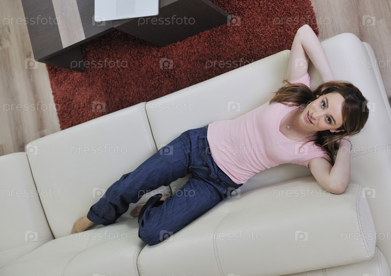 Красивая молодая женщина лежит на диване