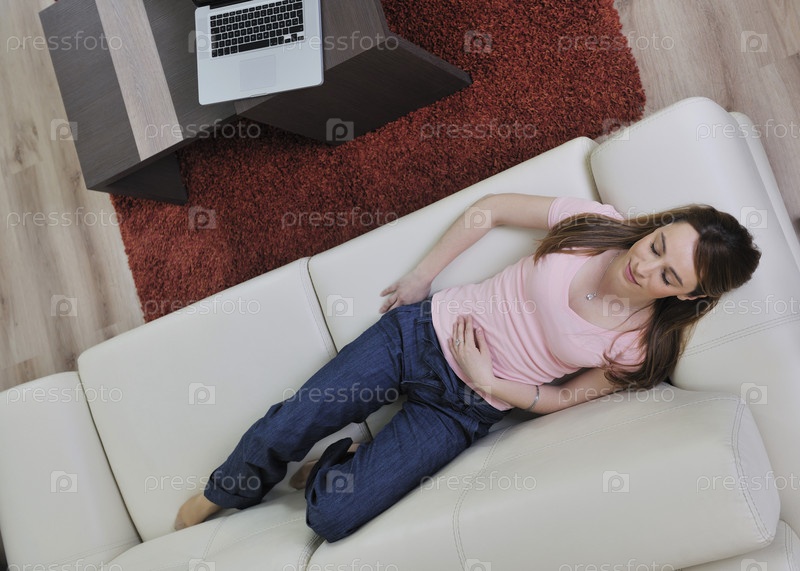 Красивая молодая женщина лежит на диване