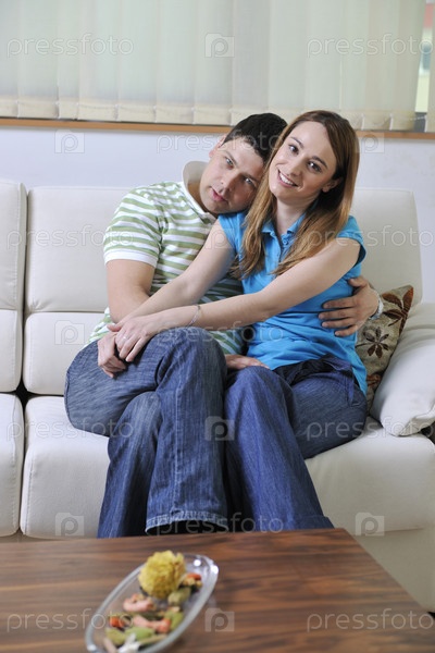 Молодая пара сидит на диване в гостиной