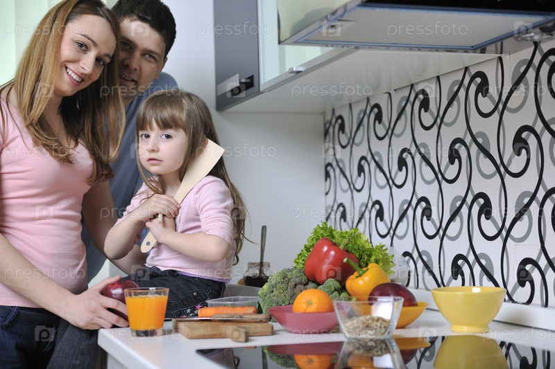 Счастливая молодая семья на кухне