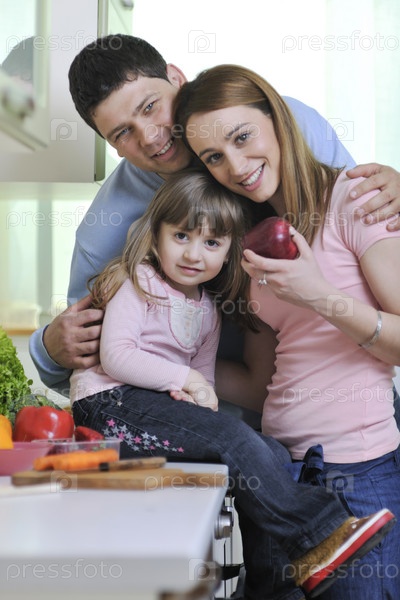 Счастливая молодая семья на кухне