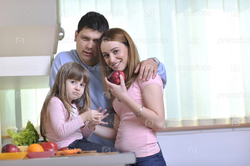 Счастливая молодая семья на кухне