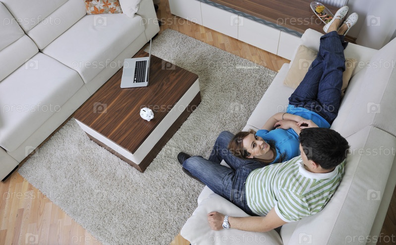 Молодая пара, лежащая на диване