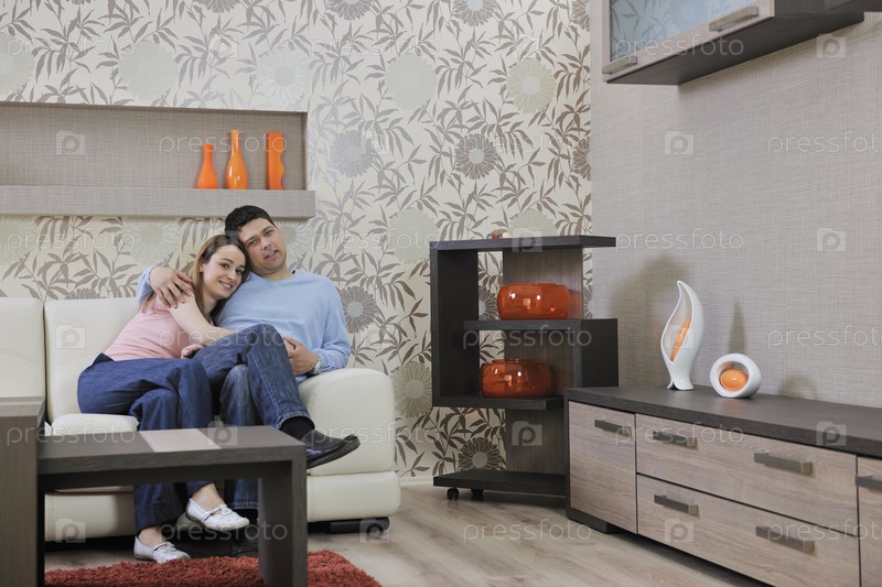 Молодая пара, сидящая на диване