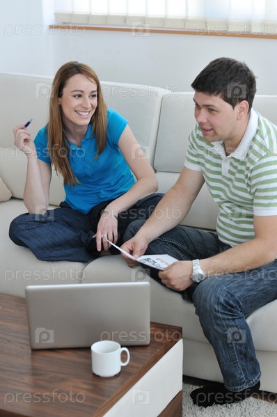 Молодая пара, сидящая на диване