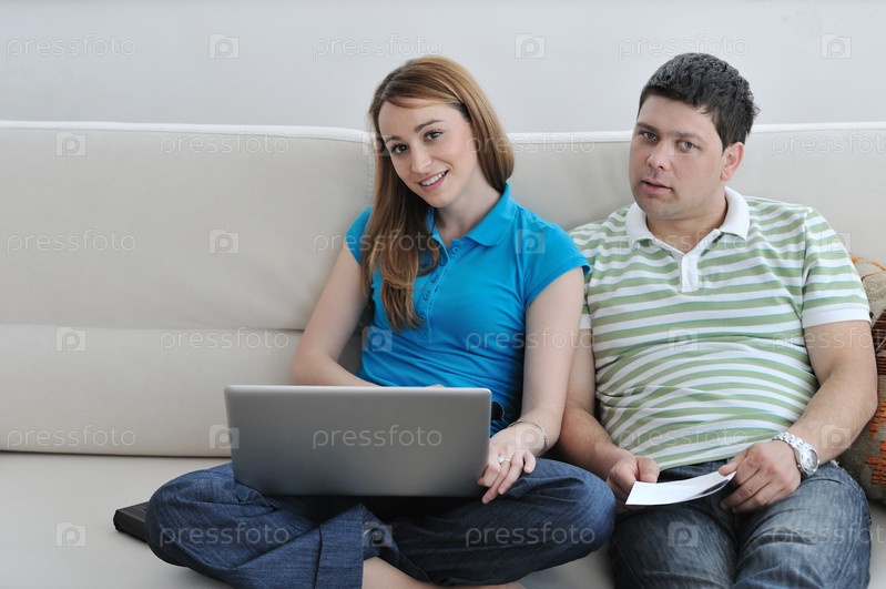 Молодая пара, сидящая на диване