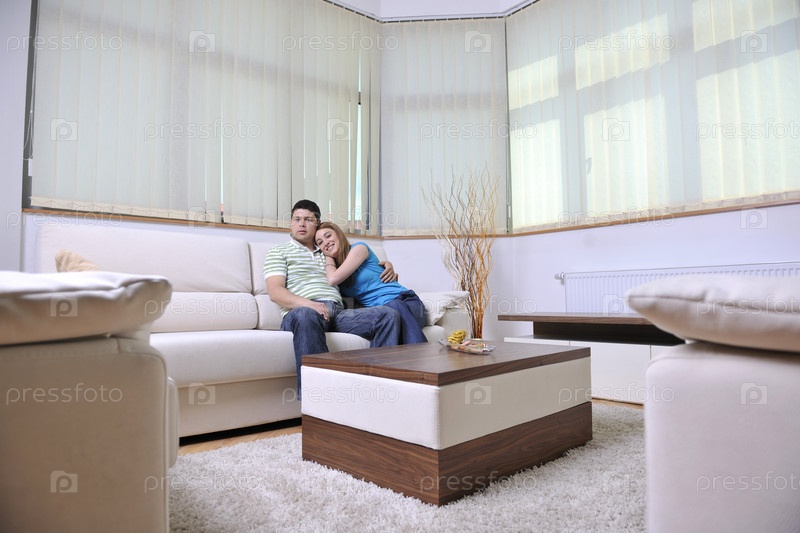 Молодая пара отдыхает на диване в современной гостиной у себя дома