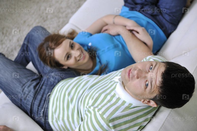 Молодая пара отдыхает на диване у себя дома