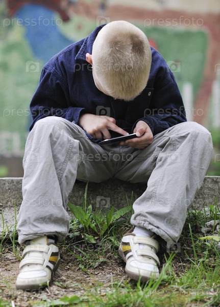 Светловолосый мальчик играет в видеоигру на открытом воздухе в парке