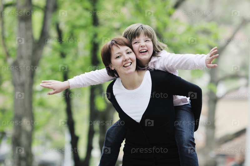 Счастливые мать с дочерью на прогулке на открытом воздухе