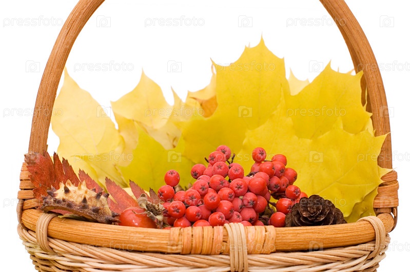 Осенние листья и ягоды в корзине