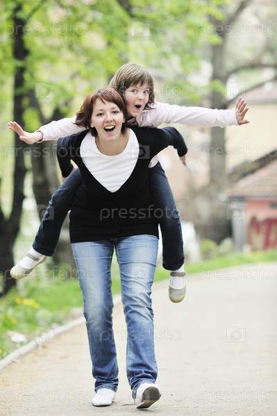 Счастливые мать с дочерью на прогулке на открытом воздухе