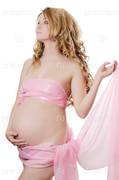 Беременная женщина, обернутая розовой лентой, стоит на белом фоне