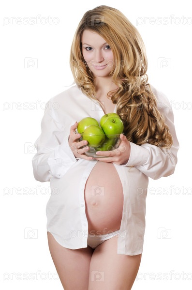 Беременная женщина с зелеными яблоками стоит на белом фоне