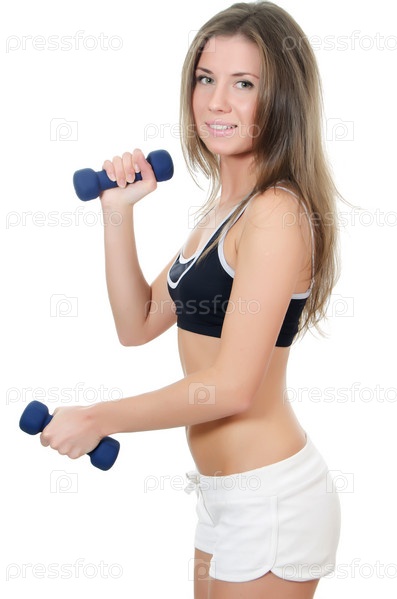 Девушка занимается с гантелями на белом фоне