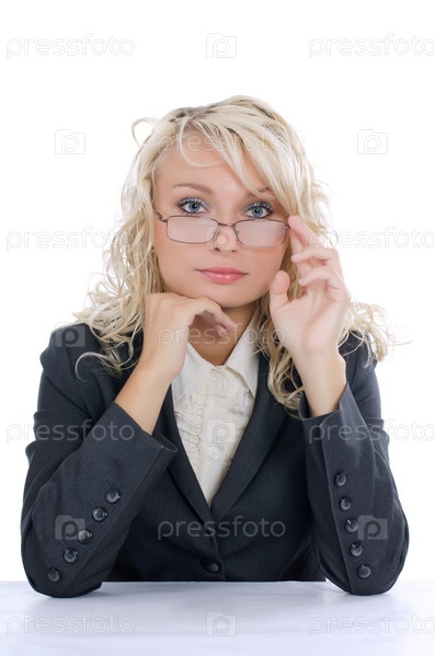 Деловая женщина сидит за столом на белом фоне