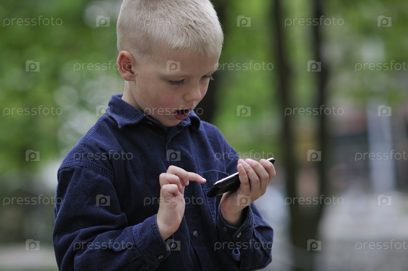Светловолосый мальчик играет в видеоигру на открытом воздухе в парке