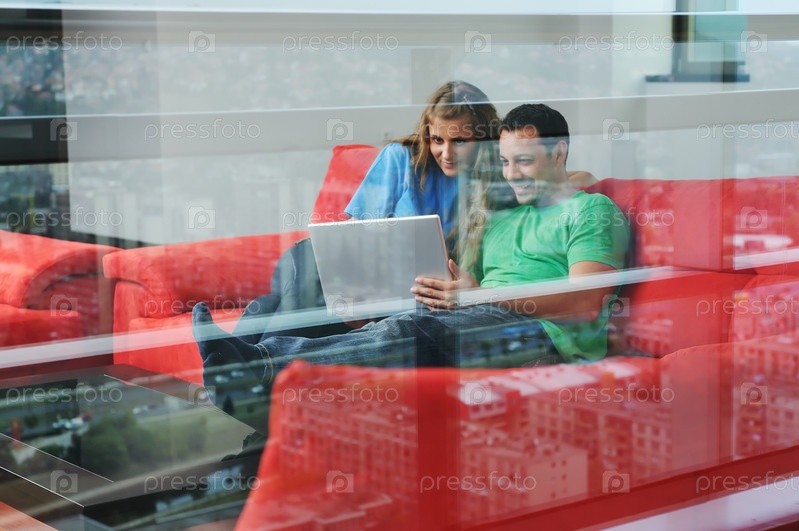 Счастливая молодая пара отдыхает на диване с ноутбуком, вид через стекло