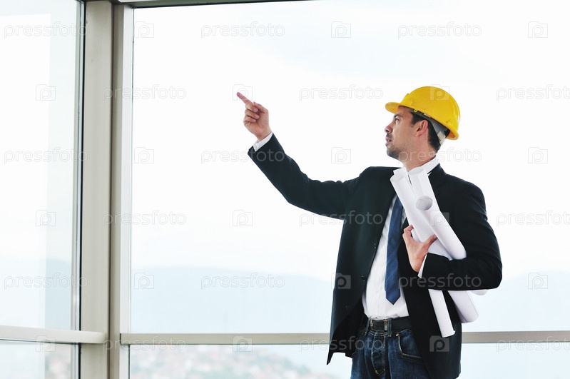 Успешный инженер-строитель в защитной каске и с чертежами в руке в помещении