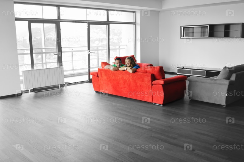 Счастливая пара отдыхает на красном диване в большой новой квартире