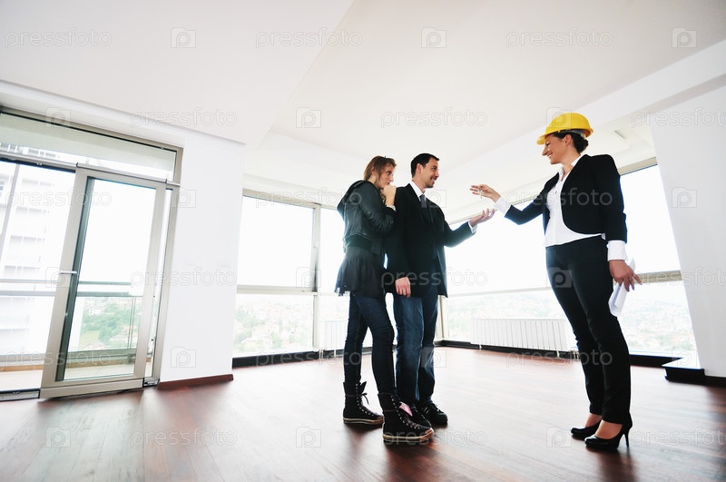 Молодая пара покупает квартиру в новом доме у агента по продаже недвижимости