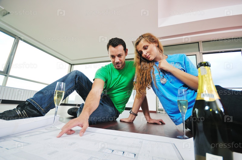 Счастливая пара сидит на полу в своей новой квартире и рассматривает чертеж