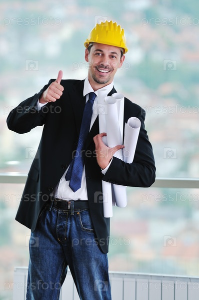 Успешный инженер-строитель в защитной каске и с чертежами в руке в помещении