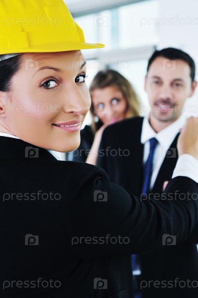 Молодая женщина в желтой каске и ее деловые партнеры в офисе