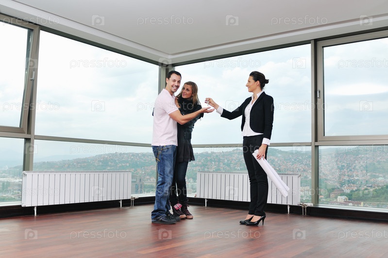 Счастливая молодая пара и агент по продаже недвижимости в новой квартире