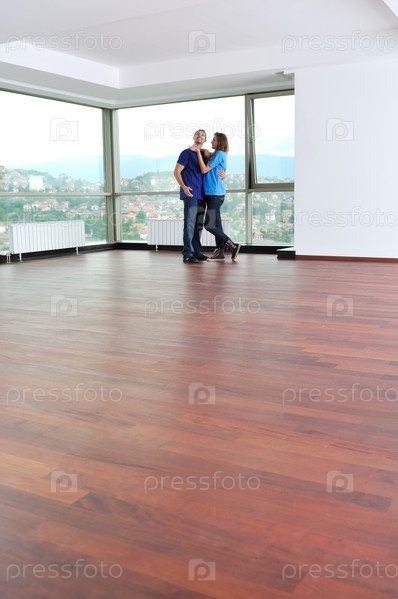 Счастливая молодая пара стоит в новой квартире