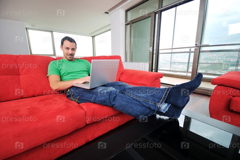 Молодой человек сидит на красном диване с ноутбуком