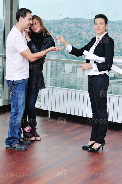 Агент по продаже недвижимости передает ключи от новой квартиры молодой паре