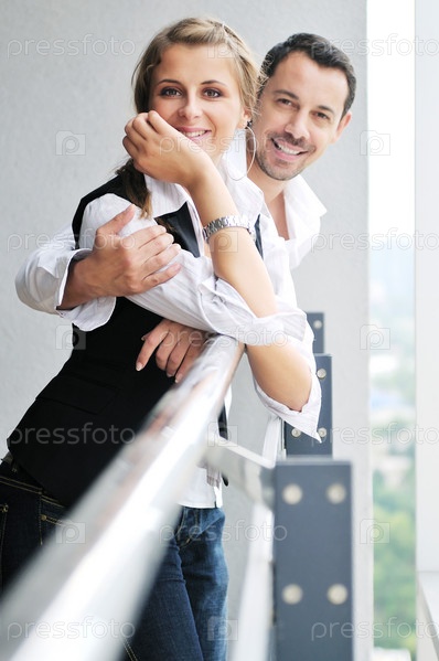 Счастливая молодая пара стоит на балконе