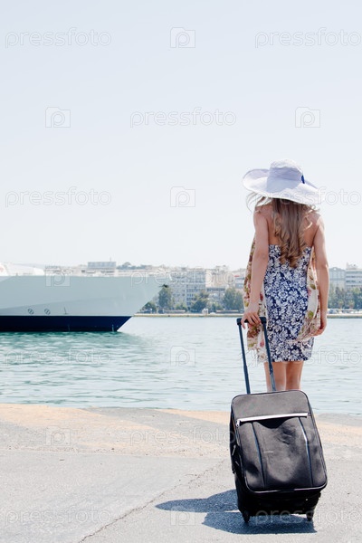 Девушка в широкополой шляпе с чемоданом стоит в морском порту