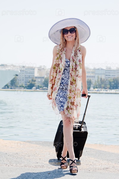 Девушка с чемоданом стоит в морском порту