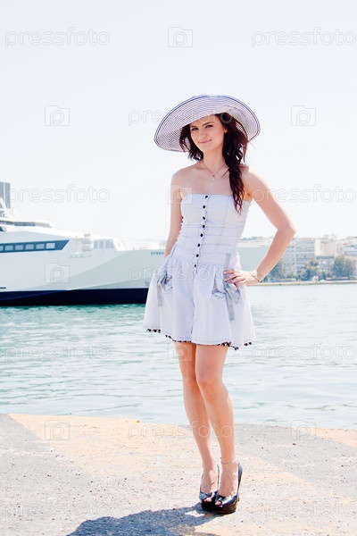 Девушка в широкополой шляпе стоит в морском порту