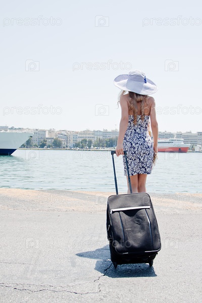 Девушка с чемоданом стоит в морском порту