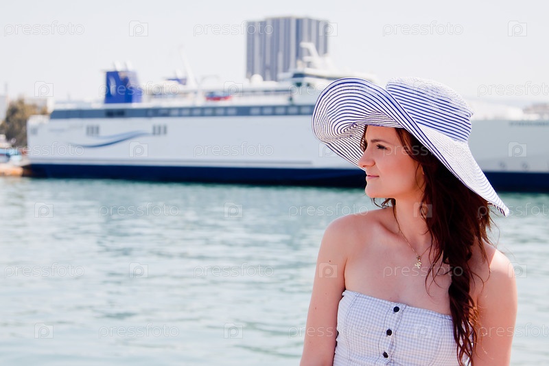 Молодая женщина в широкополой шляпе на фоне океанского лайнера