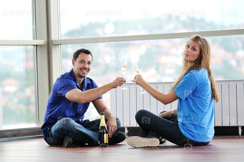 Счастливая пара в новой квартире с бокалами шампанского