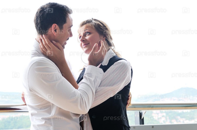 Счастливая пара у окна в новой квартире