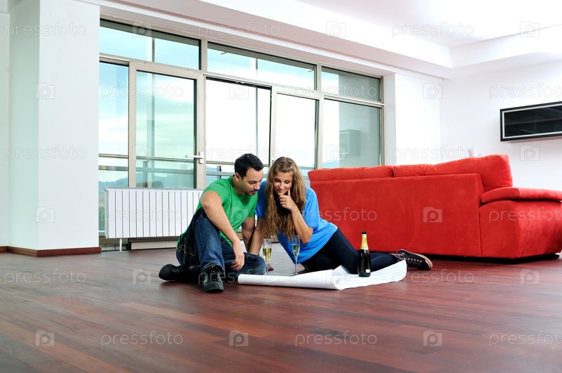 Счастливая пара в новой квартире с бокалами шампанского