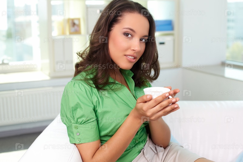 Красивая молодая женщина пьет чай, сидя на диване