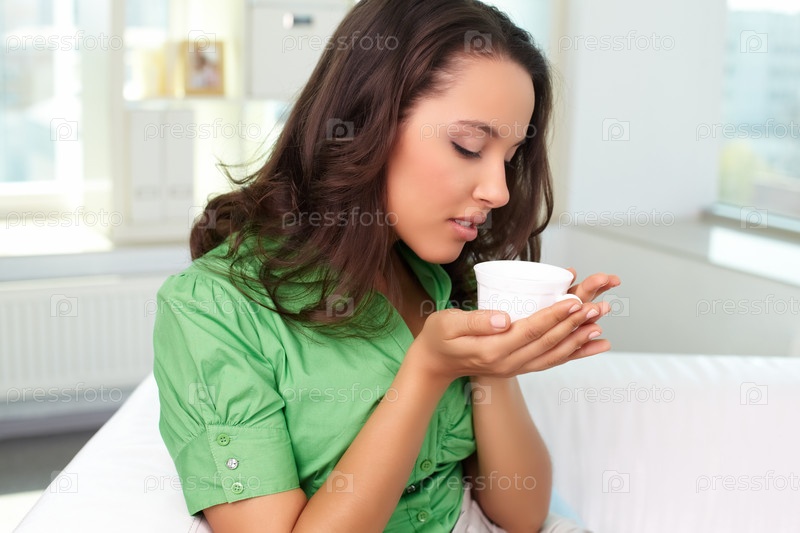 Красивая молодая женщина наслаждается ароматом чая, сидя на диване