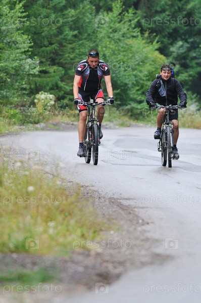 Двое молодых людей едут на велосипедах по дорожке через лес
