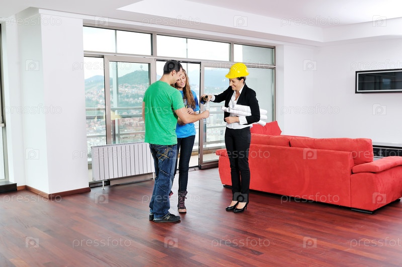 Агент по недвижимости передает ключ от новой квартиры молодой семейной паре
