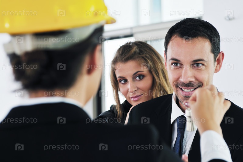 Агент по недвижимости передает ключ от новой квартиры молодой семейной паре